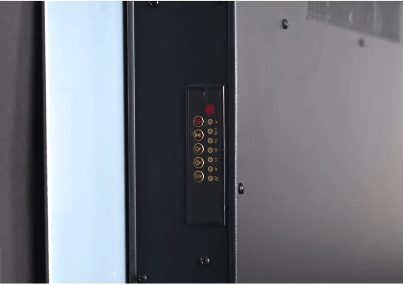 Designed for comfort and convenience, the fireplace offers two adjustable heat settings – 750W and 1500W, easily controlled via the sleek touch panel on the unit or the included remote control. The integrated programmable heat timer allows you to set automatic shut-off from 30 minutes up to 7.5 hours, making it ideal for energy-efficient home heating.