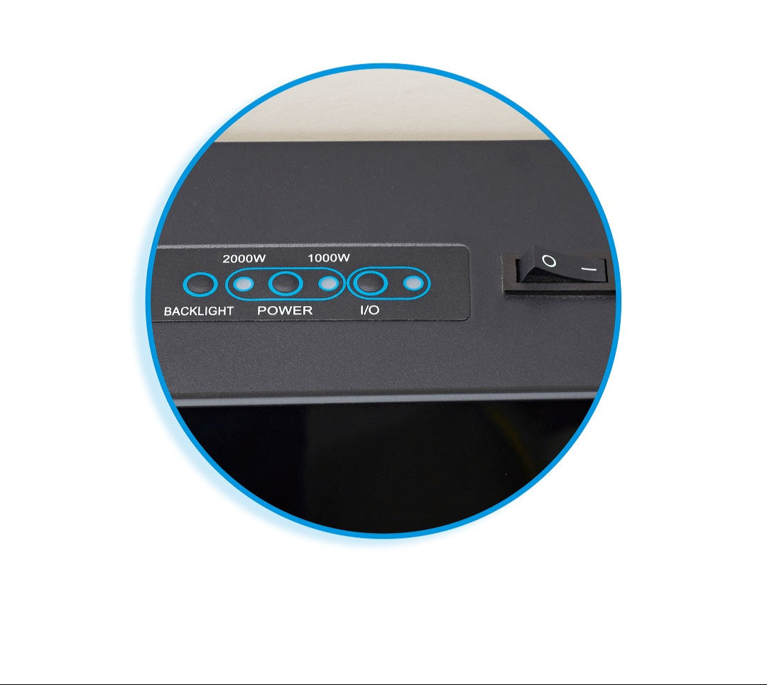 - 2 levels – 1000W & 2000W, thermostat controlled.