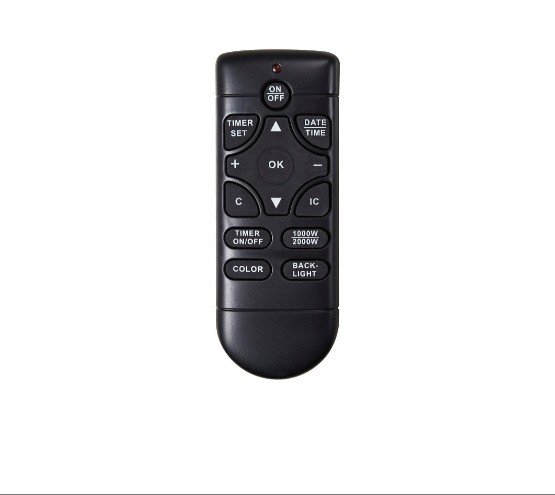 The fireplace also features an onscreen display showing time, date, heat setting (min, max, or auto), and programmable timers. You can set up to 10 individual timers, ranging from 1 minute to 23 hours 50 minutes, making it ideal for energy-saving operation and daily routines.